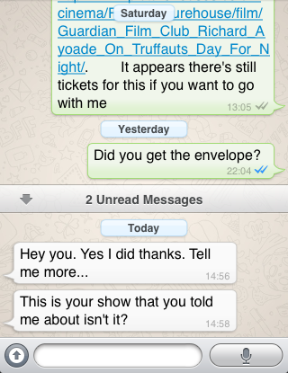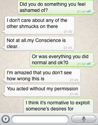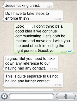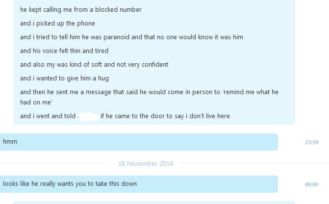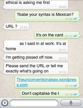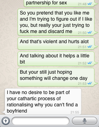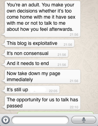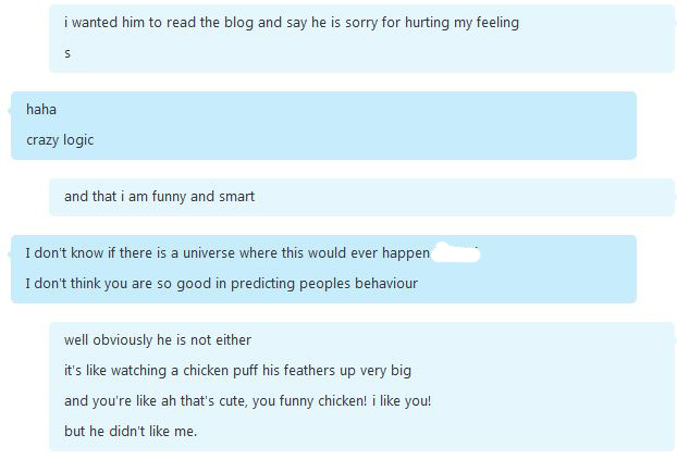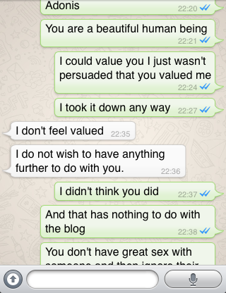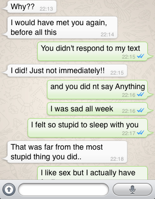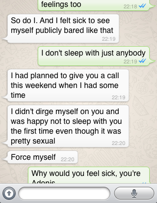 After that I remember chatting a bit about orgasms (no reason) and listening to some songs he was writing at the moment. He said that he appreciated the Facebook status as my clever way of getting him to call me (?), but he was planning to call me anyway. He said he had to go, so I asked him what the function of the call was. Was he only trying to get the scoop on my dumping, or did he want to meet up before I went to Berlin?